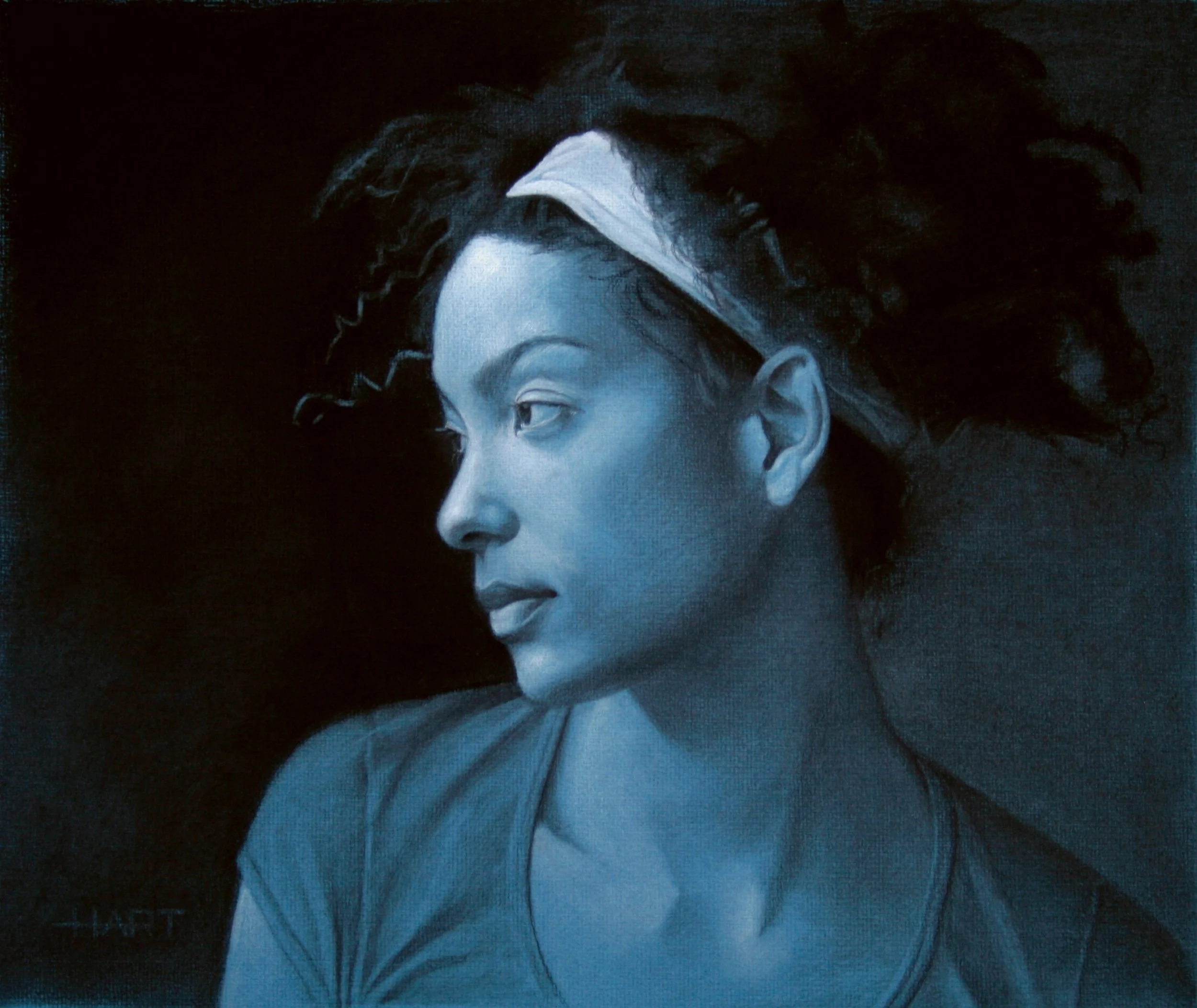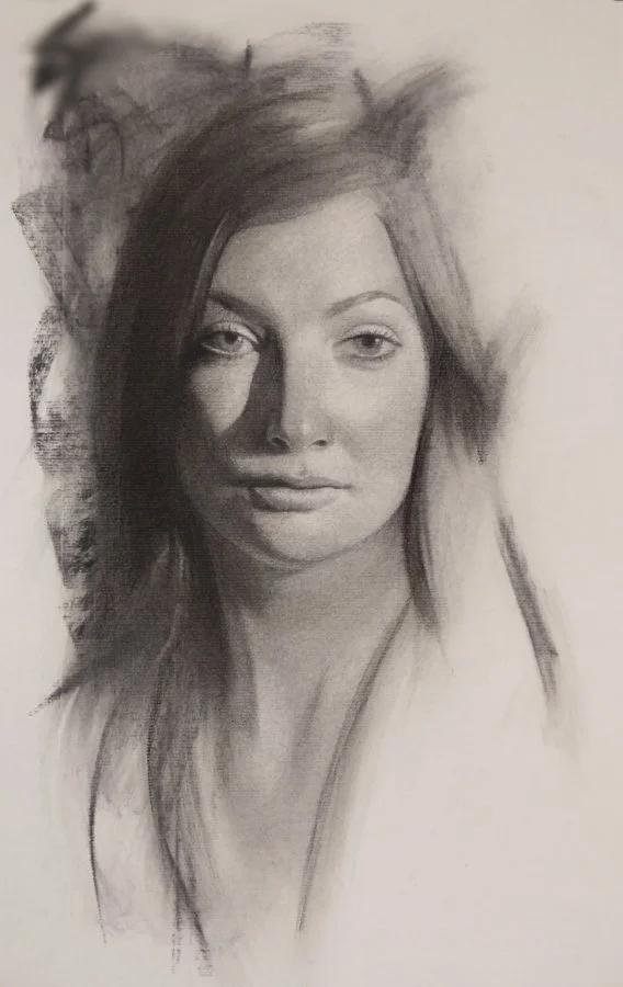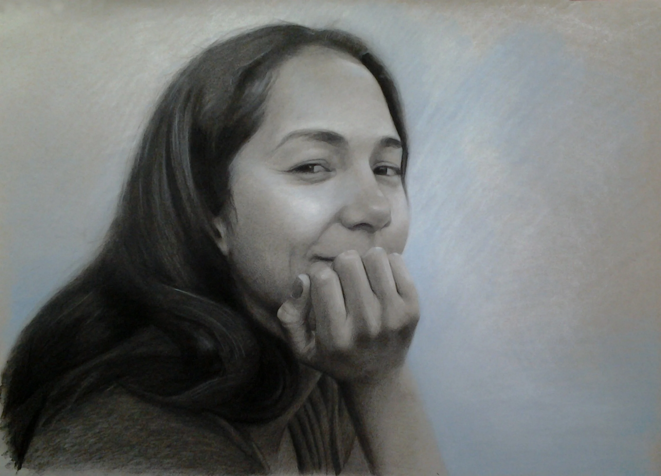 Portrait of Oritana, charcoal, white chalk and blue pastel on toned paper, 17" x 12.5"
